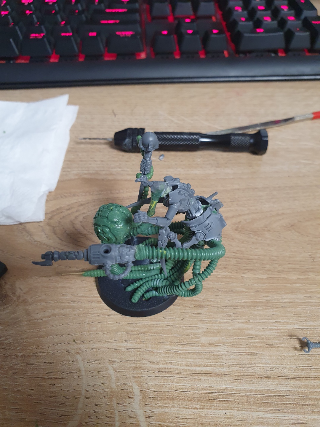 그냥 워리어 몸통 아래에 곧바로 저 기계 촉수를 박았다가는 너무 볼품없을 거 같아서 몸통과 촉수의 연결 부위 그러니까 배를 만들기로 했습니다. 비츠는 카놉텍 레이스의 얼굴-목 부위를 사용했고, 단단하게 지탱해서 추후 운반에도 문제가 생기지 않도록 황동봉을 안에 넣은 촉수를 꽂아넣어 40mm베이스에 잘 붙여줍니다.
