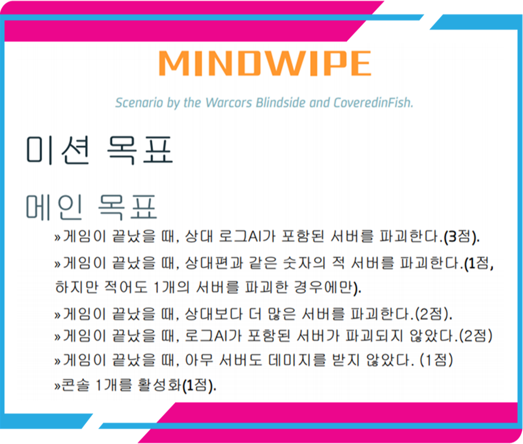 마인드와이프는 각기 배치구역에 3개의 서버, 그리고 중앙엔 로그ai를 드러내는 콘솔이 2개가 있습니다.