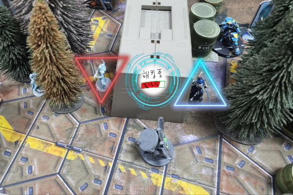 그리고 턴 끝에서 판오세아니아측 정의의 기사 유닛이 제 할로우맨 하나에게 해킹(임모빌라이즈+아이솔레이트)를 걸어 문자 그대로 깡통으로 만들어버립니다.