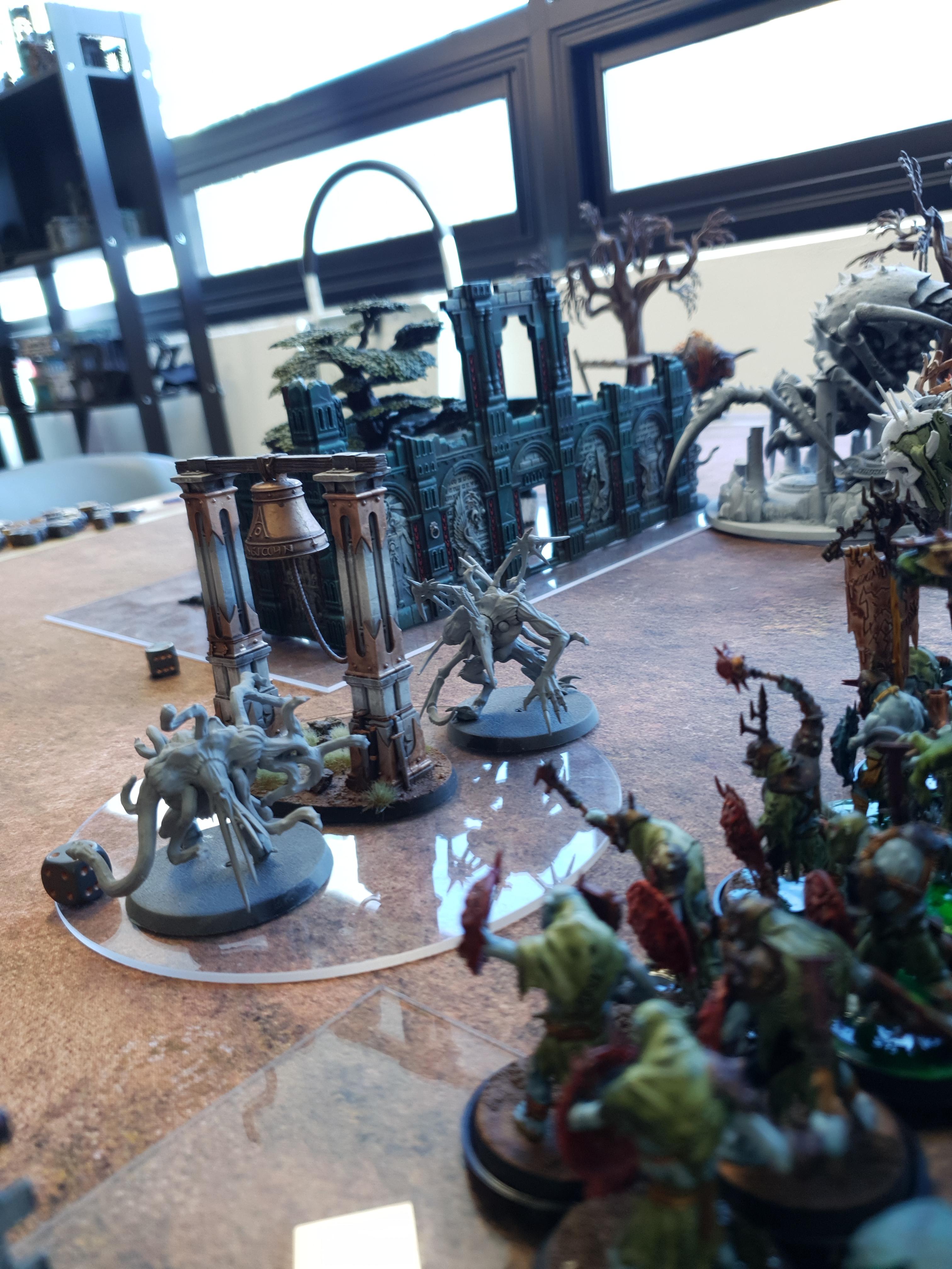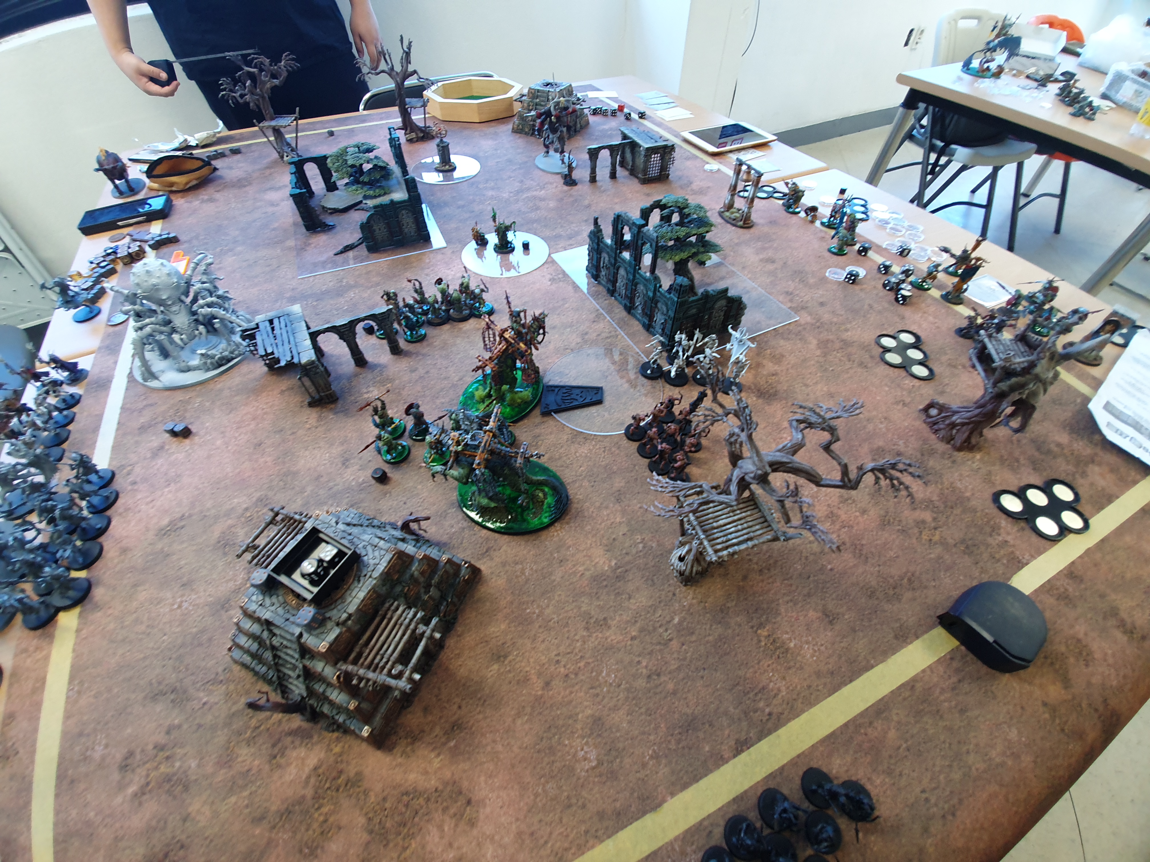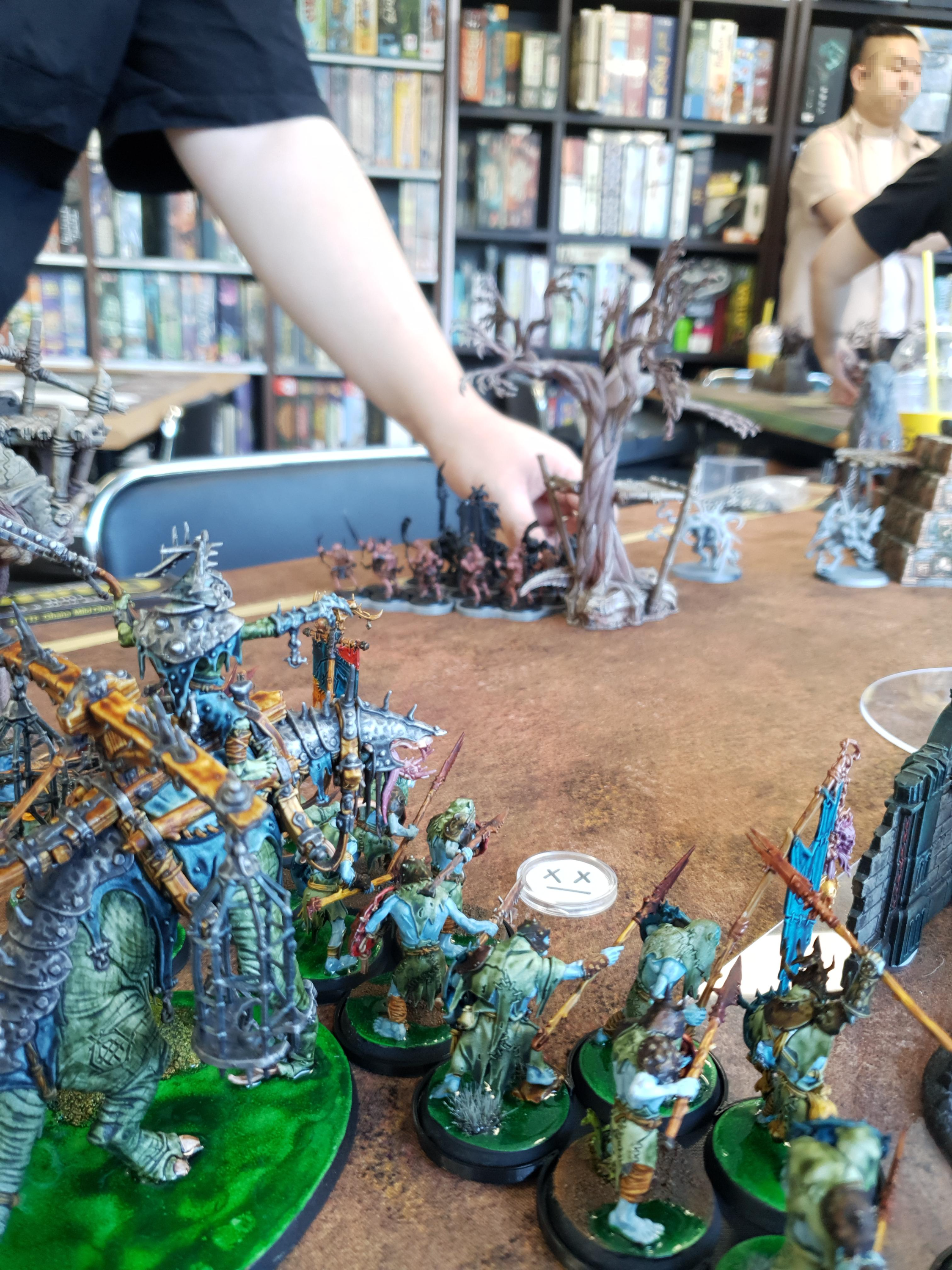 크룰 측은 늪지괴수 뒷편으로 다가오는 고어들은 늪지괴수들에게 그리 큰 위협이 되지않는다고 판단해 늪지괴수들로 적은 수의 것리파 유닛1은 보호(대전략을 위해)하는 한편, 실질적으로 늪지괴수를 잡고 게임을 터뜨릴 수 있는 비맨 전력인 고르곤의 차지를 막기 위해 많은 수의 것리파 유닛2은 그 사이 길목에 배치해두고 턴을 종료합니다.