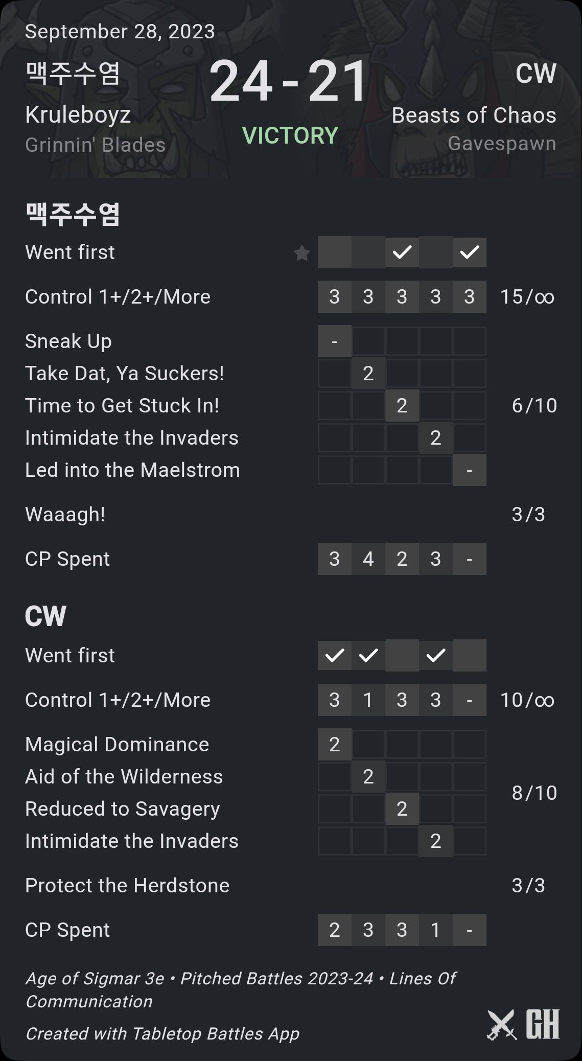 비스트 오브 카오스는 게이브스폰 섭팩으로서 강화된 스폰인 몰구라이트 스폰을 다수 들고왔고, 그리닌 블레이드 섭팩의 크룰보이즈는 몬스터 위주지만 거기에 더해 자유로이 리저브 상태로 빠질 수 있는 스키터스트랜드 아라크나록을 용병으로 고용해 비맨 딜링의 핵심 원천인 허드스톤을 노리고자 합니다.