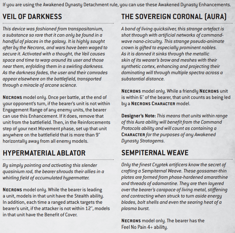 인덱스 네크론의 핵심 중의 핵심, 필수 그 자체인 인핸스먼트입니다. 네크론은 리더에 대한 의존도가 높은데 이를 무려 오라로 뿌려버리는, 굉장히 강력한 인핸스먼트로서 이를 통해 일반적으로 캐릭터가 합류될 수 없는 유닛들(차량이나 몬스터 등)이나 합류 조건이 안맞는 다른 유닛들까지도 전부 리더가 이끄는 것으로 취급해 디테치룰(캐릭터가 이끌 시 힛롤+1)과 스트라타젬 추가 조건(캐릭터 이끌 시 추가로 발동되는 효과들)이 전부 적용됩니다. 진짜 강력해요.